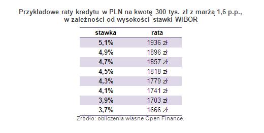 Przykładowe raty kredytu w PLN na kwotę 300 tys. zł z marżą 1,6 p.p., w zależności od wysokości stawki WIBOR