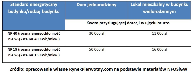 Według założeń programu powyższe kwoty powinny skompensować część dodatkowych kosztów, które wiążą się z nabyciem lub wybudowaniem typowego lokum o standardzie energetycznym NF15 lub NF40. Pozostała część wydatków będzie pokrywana dzięki niższym kosztom eksploatacji budynku