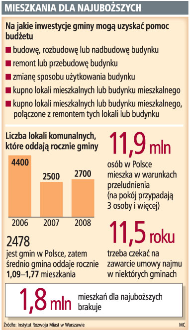 Gminy mogą już składać wnioski o wsparcie z budżetu nawet do 50 procent kosztów budowy mieszkań socjalnych. Pomimo ustawowego obowiązku, tylko niewielka część samorządów uchwaliła własne plany mieszkaniowej strategii. Samorządy masowo pozbywają się komunalnego zasobu mieszkaniowego.