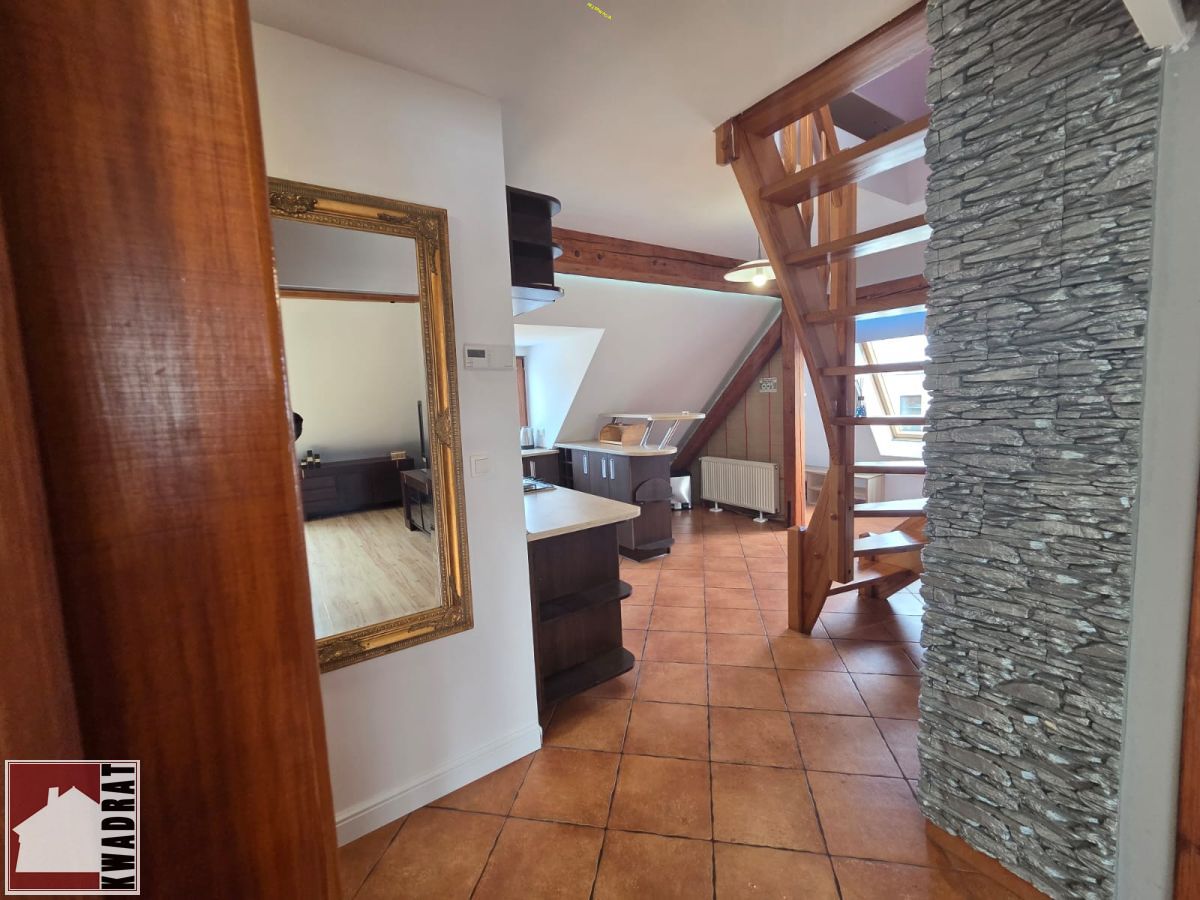 Ładne, bardzo ustawne mieszkanie ze skosami ( powierzchnia podłogi około 60 m2, powierzchnia w akcie 34,20 m2). Mieszkanie II poziomowe, składa się z 3 pokoi, kuchni, jadalni, spiżarki, przedpokoju oraz łazienki z wc.